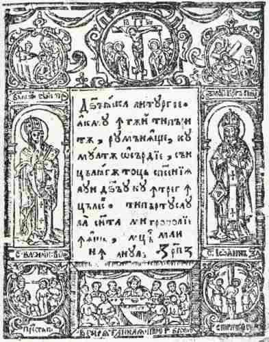 Dumnezăiasca liturghie (Godly Liturgy) acmu întăi tipări- // now first print- tă rumânește, cu // ed in Romanian, with multă osîrdie, să-n // much eagerness, all to un țăleagă toț spăsenia // derstand the salvation lui Dumnezău cu întreg în // of God with full me țăles. Tipăritu-s-au // aning. Printed la svînta Mitropolie // at the Holy Metropolitan în Iaș, mesiță mai, // in Iași, month of May, în anul 7187. // in the year 7187. |