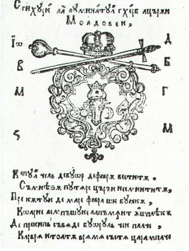 Stihuri la luminatul herb a Țărîi Moldovei Cipher of the coat of arms: IO[an] D[uca] V[oevoda] B[ojieio] M[ilostio] G[ospodar] Z[emli] M[oldavscoi], meaning John Duca Voivod, from the Grace of God Prince of the Land of Moldavia Capul cel de buor, de fiară vestită Sămnează putere țărîi nesmintită. Pre cîtu-i de mare fiara și buiacă, Coarnele-n pășune la pămînt îș pleacă. De pre chip să vede buorul ce-i place, C-ar vrea-n toată vremea să stea țara-n pace.
