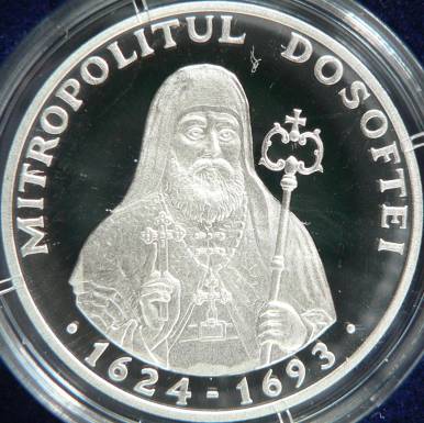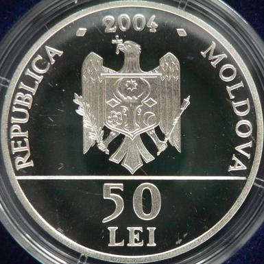 30 mm diameter, 16.5 g, 92.5% silver, flat edge year 2004, circular inscription REPUBLICA MOLDOVA meaning "REPUBLIC OF MOLDAVIA" and the coat of arms of the Republic of Moldavia, in exergue denomination "50 LEI" | metropolitan Dosoftei of Moldavia holding a bishop staff, inscription MIRTOPOLITUL DOSOFTEI·1642-1693 meaning "METROPOLITAN DOSOFTEI" |