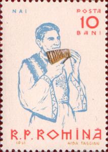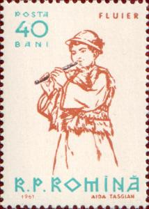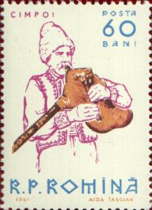 several traditional musical instruments - a violin, a bagpipe, three flutes and three panpipes, inscription "INSTRUMENTE MUZICALE TRADIȚIONALE" meaning "TRADITIONAL MUSICAL INSTRUMENTS"