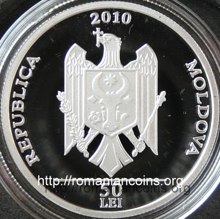 30 mm diameter, 16.5 g, 99.9% silver, grained edge year 2010, circular inscription REPUBLICA MOLDOVA meaning "REPUBLIC OF MOLDAVIA" and the coat of arms of the Republic of Moldavia, in exergue horizontal line and denomination "50 LEI" |
