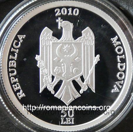 28 mm diameter, 13 g, 99.9% silver, grained edge year 2010, circular inscription REPUBLICA MOLDOVA meaning "REPUBLIC OF MOLDAVIA" and the coat of arms of the Republic of Moldavia, in exergue horizontal line and denomination "50 LEI" |