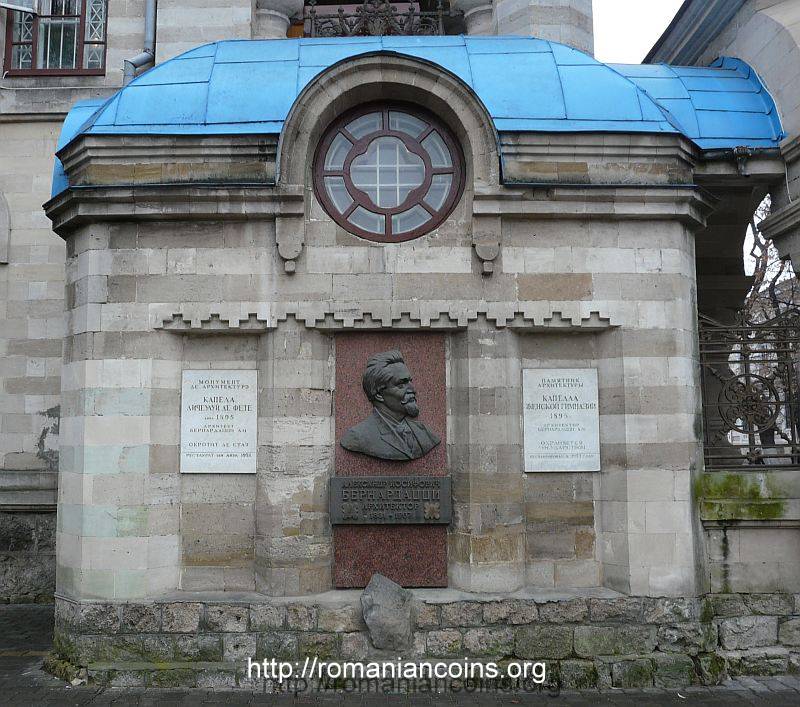 bust of the architect, an image of the Saint Teodora of Sihla church from Chișinău, inscription ALEXANDRU BERNARDAZZI and years 1831-1907