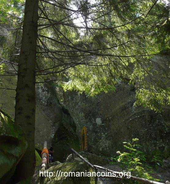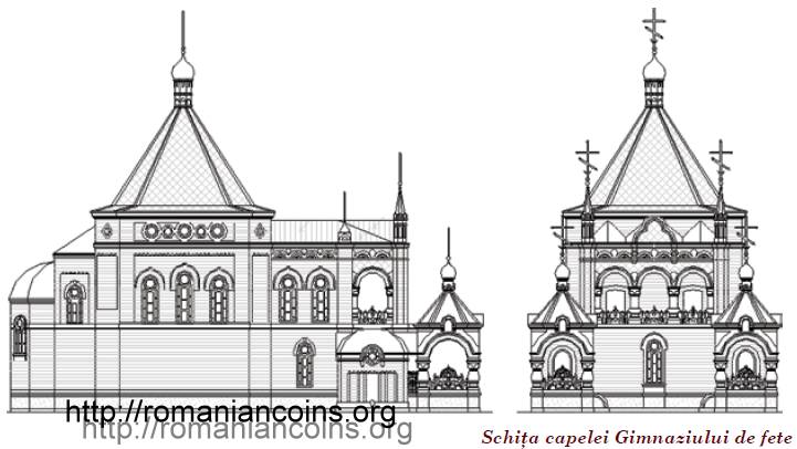 Also on the reverse, a front view of the church "Saint Theodora from Sihla" as seen from north-west appears. The design does not have any real photo of the edifice behind it; a plan from the old times was used instead, drawn in parallel perspective. Most likely the plan was taken from monograph "O corabie a mîntuirii" (2009) ["A Ship of Salvation"] of priest Ioan Ciuntu, [2, p. 22], who reproduced it recently.