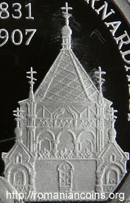 The coin features on the reverse the side portrait of architect Alexandru Bernardazzi, inspired by the bas-relief placed in 1983 on the north-eastern wall of the church (restored in 1974). The bas-relief is the work of sculptor Nicolae Gorionyshev (born in 1929), the monument itself being designed by architect Valentin Mednek (1910-1995).