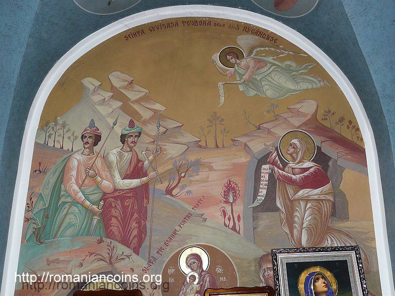 Today, the church is restored and repainted, displaying numerous Romanian saints, either by birth or adoption: Stephen the Great and the Holy, Daniil Sihastrul [the Hermit], John the New from Suceava, Saint Paraschiva, Saint Theodora from Sihla, Brâncoveanu Saints and others.