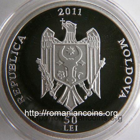 28 mm diameter, 13 g, 99.9% silver, grained edge year 2011, circular inscription REPUBLICA MOLDOVA meaning "REPUBLIC OF MOLDAVIA" and the coat of arms of the Republic of Moldavia, in exergue horizontal line and denomination "50 LEI" |