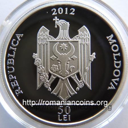 30 mm diameter, 16.5 g, 99.9% silver, grained edge year 2012, circular inscription REPUBLICA MOLDOVA meaning "REPUBLIC OF MOLDAVIA" and the coat of arms of the Republic of Moldavia, in exergue horizontal line and denomination "50 LEI" |