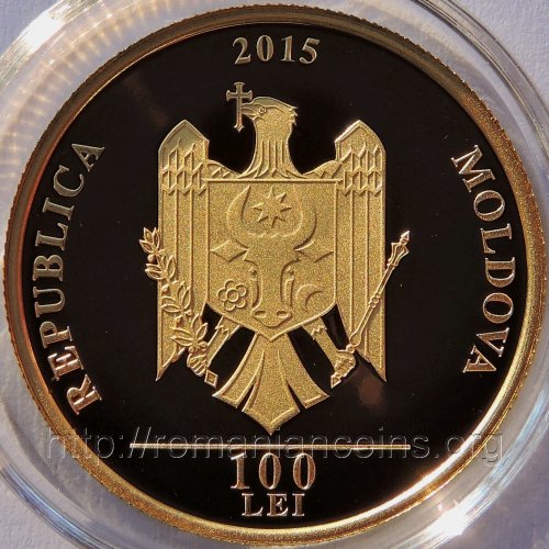 24 mm diameter, 7.8 g, 99.9% gold, grained edge year 2015, circular inscription REPUBLICA MOLDOVA meaning "REPUBLIC OF MOLDAVIA" and the coat of arms of the Republic of Moldavia, in exergue horizontal line and denomination "100 LEI" |