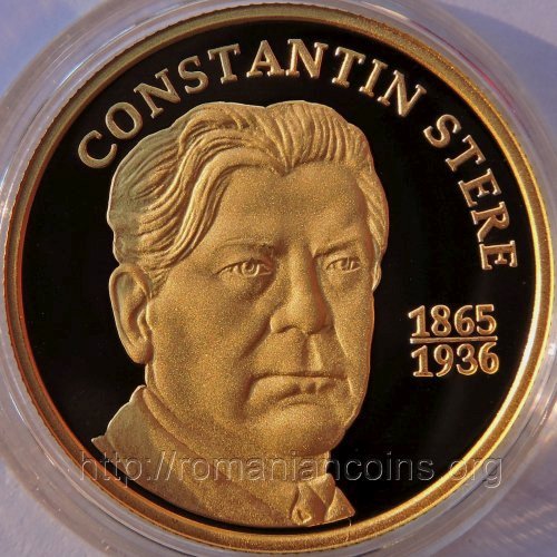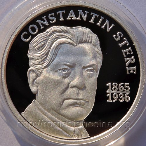 As the historical note on the certificate of authenticity accompanying the coin puts it, "Constantin Stere [...] is one of the outstanding Romanian political and intellectual figures of the late XIXth century - early XXth century. A particularly complex personality - jurist, teacher, journalist, ideologist, writer and politician - Constantin Stere supported the national awakening movement between the Prut and Nistru Rivers and saw his dream come true, contributing to the union of Bessarabia with Romania (1918). He brought a great contribution to the education of the students from Bessarabia in the spirit of national ideals. He carried out important work in the Sfatul Țării (parliament). Constantin Stere is still and will remain an outstanding symbol of the national unity."