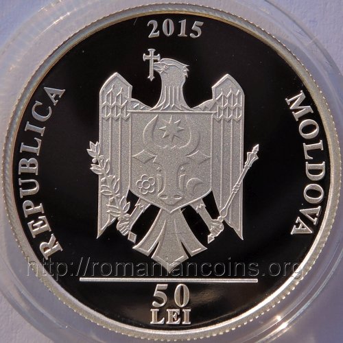 28 mm diameter, 13 g, 99.9% silver, grained edge year 2015, circular inscription REPUBLICA MOLDOVA meaning "REPUBLIC OF MOLDAVIA" and the coat of arms of the Republic of Moldavia, in exergue horizontal line and denomination "50 LEI" |