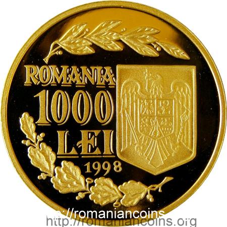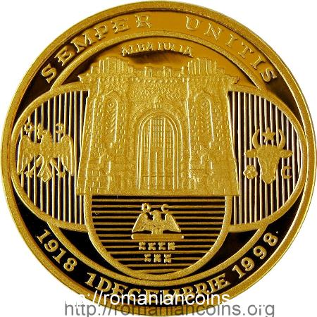 35 mm diametru, 31.103 g, aur 99.9%, margine netedă Avers: valoarea nominală 1000 LEI, anul 1998, ROMANIA, stema României, deasupra o ramură de laur, dedesubt o ramură de stejar | Revers: inscripția circulară în limba latină SEMPER UNITIS însemnînd TOTDEAUNA UNIȚI, inscripția 1918 1 DECEMBRIE 1998, în mijloc Sala Unirii din Alba Iulia, deasupra scris ALBA IULIA, în dreapta stema Țării Românești, în stînga stema Moldovei și dedesubt stema Transilvaniei