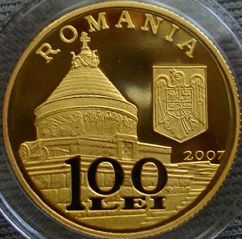 21 mm diametru, 6.452 g, 90% aur, margine cu zimți Avers: ROMANIA, stema României, anul 2007, valoarea nominala 100 LEI, o imagine a Mausoleului de la Mărășești | Revers: soldați români luptînd la Mărăști, anul 1917, inscripțiile MARASTI-MARASESTI-OITUZ și Pe aici nu se trece!”