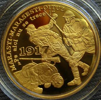 Moneda aniversează împlinirea a 90 de ani de la victoriile armatei române de la Mărăști, Mărășești și Oituz. Imaginile acestei monede omagiale de 100 lei de aur sînt prezente pe site prin deosebita amabilitate a domnului Radu Lissner.