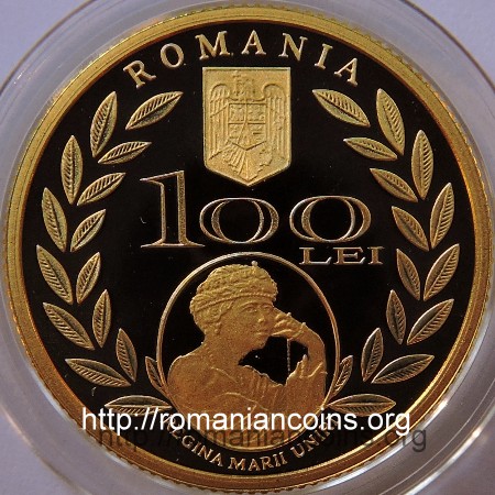 21 mm diametru, 6.452 g, 90% aur, margine cu zimți Avers: ROMANIA, stema României, valoarea nominală 100 LEI, medalion cu o imagine a reginei Maria, cunună de lauri și inscripția REGINA MARII UNIRI | Revers: un portret al reginei Maria purtând coroana regală (cu care a fost încoronată la Alba Iulia în 1922), anii 1875 și 2010, inscripția REGINA MARIA A ROMANIEI MARI
