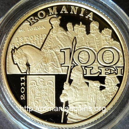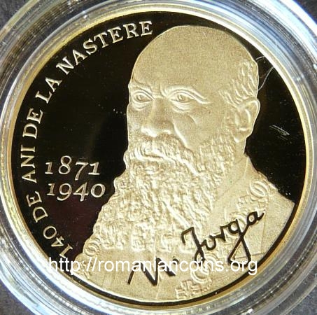21 mm diametru, 6.452 g, 90% aur, margine cu zimți Avers: ROMANIA, valoarea nominală 100 LEI, anul 2011, stema României, o copertă a unui volum din Istoria românilor de Iorga, o scenă istorică: intrarea victorioasă a voievodului Mihai Viteazul în Alba Iulia | Revers: bustul lui Nicolae Iorga, peste piept semnătura istoricului, inscripția circulară 140 DE ANI DE LA NASTERE, anii 1871 și 1940