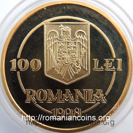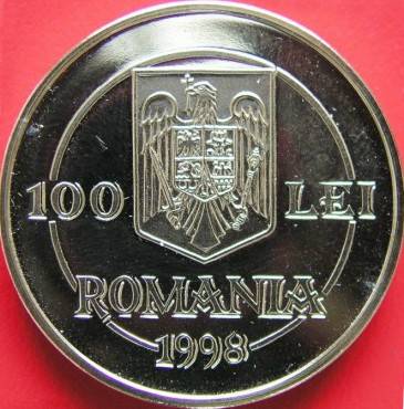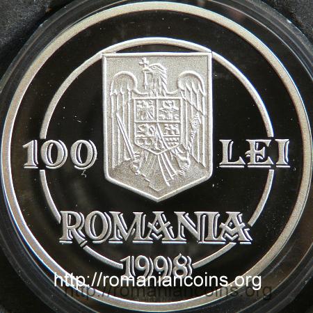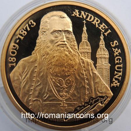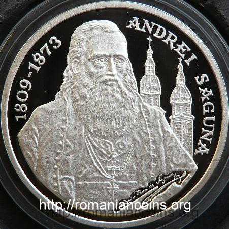 37 mm diametru, 27 g, 92.5% argint, margine netedă Avers: stema României, valoarea nominală 100 LEI, ROMANIA, anul 1998, cerc liniar interior | Revers: 1809 - 1873, ANDREI SAGUNA, bustul și semnătura mitropolitului (Andreiu Baron de Siaguna), în spate două turle ale catedralei mitropolitane din Sibiu