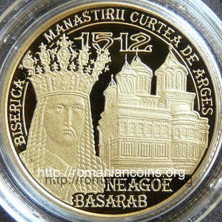 21 mm diametru, 6.452 g, 90% aur, margine cu zimți Avers: ROMANIA, valoarea nominală 100 LEI, stema României, anul 2012, pe fundal o vedere a bisericii mănăstirii de la Curtea de Argeș și raze | Revers: chipul domnitorului Neagoe Basarab, o imagine a bisericii mănăstirii de la Curtea de Argeș, anul 1512 și NEAGOE BASARAB, inscripția BISERICA MANASTIRII CURTEA DE ARGES, așezată pe arce de cerc