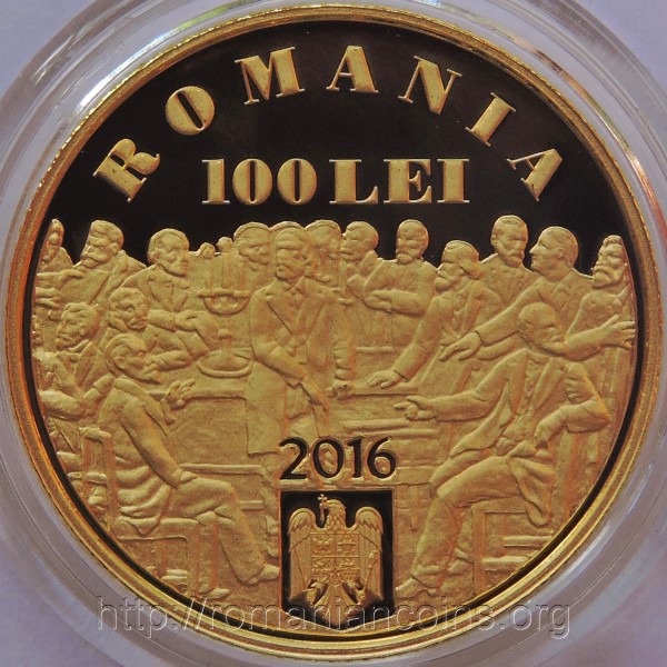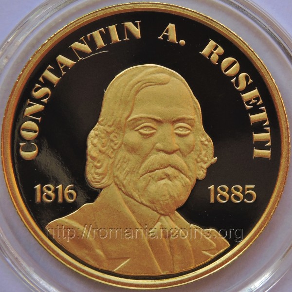 21 mm diametru, 6.452 g, aur 90%, margine cu zimți Avers: ROMANIA, valoarea nominală 100 LEI, anul 2016, stema României, un fragment din basorelieful de pe soclul statuii din București a lui C.A. Rosetti, basorelief reprezentînd alegerea lui Alexandru Ioan Cuza ca domnitor al Munteniei pe 24 ianuarie 1859 | Revers: efigia lui Rosetti, inscripția CONSTANTIN A. ROSETTI, anii 1816 și 1885
