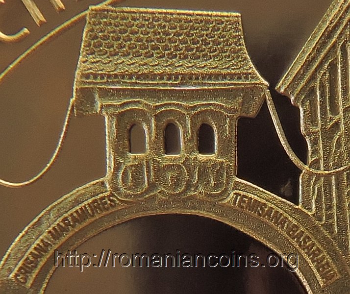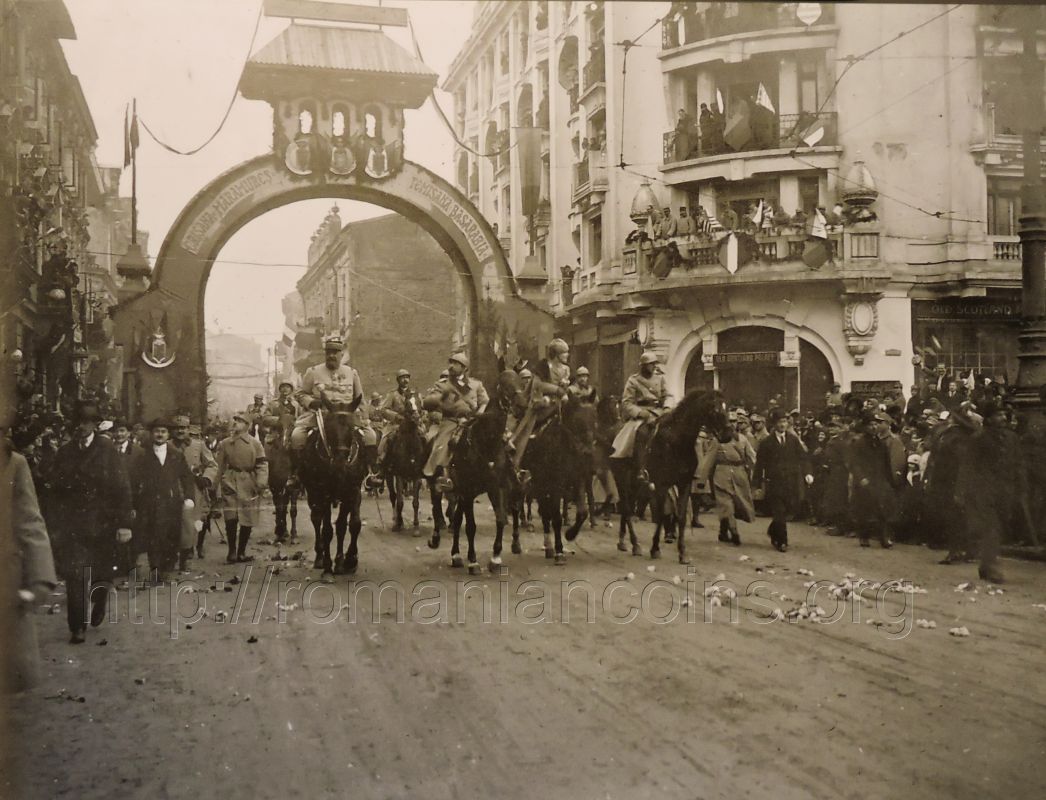 Arcul de triumf, ridicat desigur în mare grabă și făcut din lemn, fusese amplasat pe Calea Victoriei, lîngă hotelul Athénée Palace. Pe detaliul monedei se poate citi inscripția de pe Arcul de Triumf: CRIȘANA MARAMUREȘ TEMIȘANA BASARABIA.