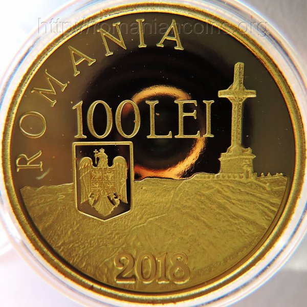 21 mm diametru, 6.452 g, aur 90%, margine cu zimți Avers: ROMANIA, valoarea nominală 100 LEI, stema României, anul 2018, o imagine a crucii de pe Caraiman de la Bușteni, cruce închinată eroilor noștri din Primul Război Mondial | Revers: intrarea regelui Ferdinand și a reginei Maria în București, anul 1918, inscripția 100 DE ANI DE LA INCHEIEREA PRIMULUI RAZBOI MONDIAL