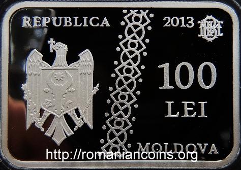40x28 mm, 28.28 g, 99.9% argint, margine cu zimți REPUBLICA MOLDOVA, anul 2013, logo-ul BNM al Băncii Naționale a Moldovei, stema Republicii Moldova, valoarea nominală 100 LEI, un motiv ornamental popular |