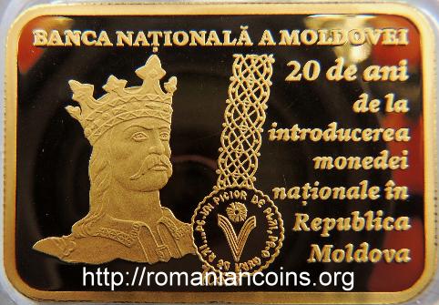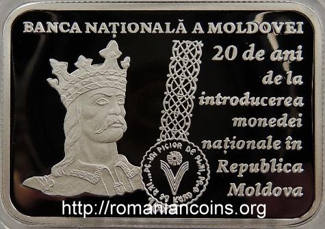 efigia lui Ștefan cel Mare și Sfînt, un ornament popular și un cerc ondulat în interiorul căruia scrie PE-UN PICIOR DE PLAI, PE-O GURĂ DE RAI..., inscripția BANCA NAȚIONALĂ A MOLDOVEI 20 de ani de la introducerea monedei naționale în Republica Moldova