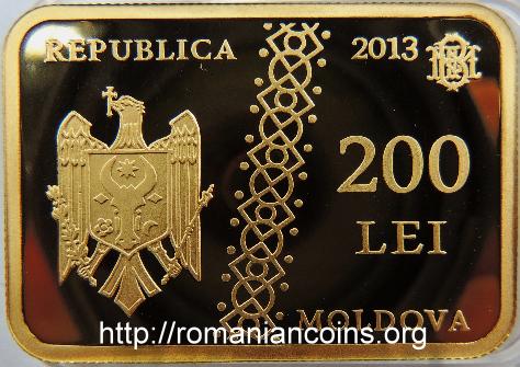 40x28 mm, 15.5 g, 99.9% aur, margine cu zimți REPUBLICA MOLDOVA, anul 2013, logo-ul BNM al Băncii Naționale a Moldovei, stema Republicii Moldova, valoarea nominală 200 LEI, un motiv ornamental popular |