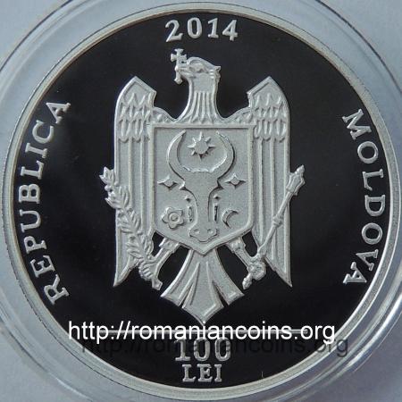 28 mm diametru, 13 g, 99.9% argint, margine cu zimți anul 2014, REPUBLICA MOLDOVA, stema Republicii Moldova, în exergă linie orizontală și valoarea nominală 100 LEI |