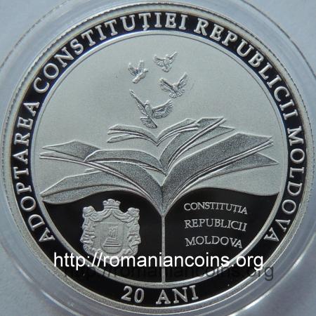 o carte deschisă din care își iau zborul patru porumbei, la stînga-jos stema Curții Constituționale a Republicii Moldova, inscripțiile CONSTITUȚIA REPUBLICII MOLDOVA, ADOPTAREA CONSTITUȚIEI REPUBLICII MOLDOVA și 20 ANI