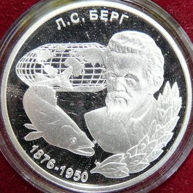 | 32 mm diametru, 14.14 g, 92.5% argint, margine netedă valoarea nominală 100 RUBLEI, anul 2001, bustul geografului și biologului rus Lev Semenovici Berg lîngă o ramură de lauri, o hartă a Terrei și un șalău, inscripția L.S. BERG (cu litere chirilice) și anii 1876 - 1950 |