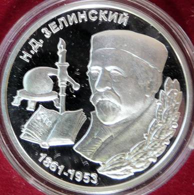 bustul chimistului rus Nicolai Dimitrievici Zelinski lîngă o ramură de lauri, o retortă, o lumînare aprinsă și o carte deschisă, inscripția N.D. ZELINSKI (cu litere chirilice) și anii 1861 - 1953 |