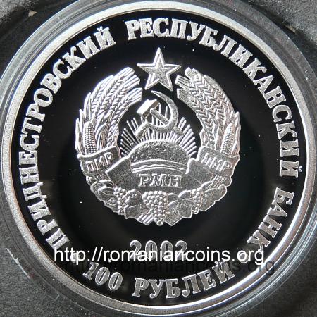 | 32 mm diametru, 14.14 g, 92.5% argint, margine netedă valoarea nominală 100 RUBLEI, stema autoproclamatei republici transnistrene (cu secera și ciocanul), inscripția · PRIDNESTROVSKII RESPUBLIKANSKII BANK · (cu litere chirilice) însemnînd BANCA REPUBLICANĂ [TRANS] NISTREANĂ, anul 2002 |