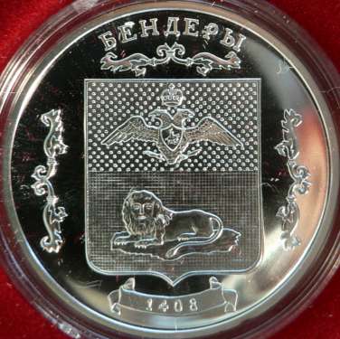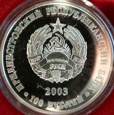 32 mm diametru, 14.14 g, argint 92.5%, margine netedă valoarea nominală 100 RUBLEI, stema autoproclamatei republici transnistrene (cu secera și ciocanul), inscripția · PRIDNESTROVSKII RESPUBLIKANSKII BANK · (cu litere chirilice) însemnînd BANCA REPUBLICANĂ [TRANS] NISTREANĂ, anul 2003 | stema orașului Tighina din timpul ocupației țariste a Basarabiei, inscripția BENDERÎ (cu litere chirilice) însemnînd BENDER (numele turcesc al Tighinei), trei ornamente și o bandă cu anul 1408
