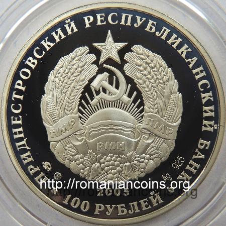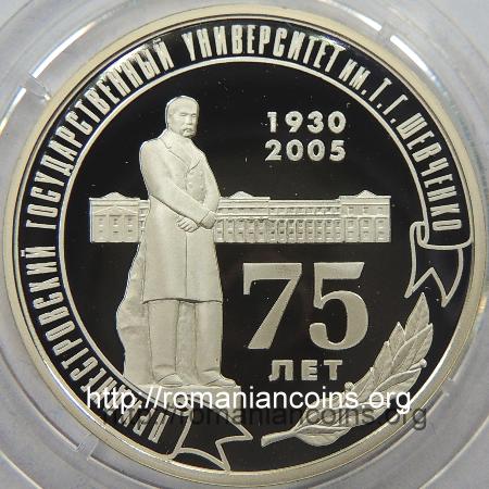 32 mm diametru, 14.14 g, argint 92.5%, margine netedă valoarea nominală 100 RUBLEI, stema autoproclamatei republici transnistrene (cu secera și ciocanul), inscripția PRIDNESTROVSKII RESPUBLIKANSKII BANK (cu litere chirilice) însemnînd BANCA REPUBLICANĂ [TRANS] NISTREANĂ, anul 2005, la stînga semne de monetărie, la dreapta Ag 925 reprezentînd titlul argintului | statuia poetului și artistului ucrainean Taras Șevcenko, anii 1930 și 2005, pe fundal clădirea principală a Universității din Tiraspol, inscripția 75 LET însemnînd 75 ANI, o ramură de laur, inscripția circulară PRIDNESTROVSKII GOSUDARSTVENNÎI UNIVERSITET IM. T.G. ȘEVCENKO (în limba rusă, cu litere chirilice) însemnînd UNIVERSITATEA DE STAT [Trans]NISTREANĂ (CU NUMELE) T.G. ȘEVCENKO Tiraj: 500 de piese |