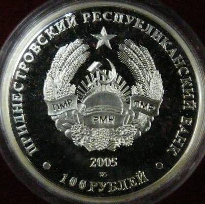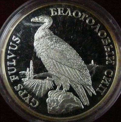 32 mm diametru, 14.14 g, argint 92.5%, margine netedă valoarea nominală 100 RUBLEI, stema autoproclamatei republici transnistrene (cu secera și ciocanul), inscripția PRIDNESTROVSKII RESPUBLIKANSKII BANK (cu litere chirilice) însemnînd BANCA REPUBLICANĂ [TRANS] NISTREANĂ, anul 2005, sub an 925 reprezentînd titlul argintului | un vultur pleșuv sur așezat pe o stîncă, inscripția BELOGOLOVÎI SIP (în limba rusă, cu litere chirilice) însemnînd VULTUR CU CAP ALB, și GYPS FULVUS, numele științific al speciei Tiraj: 500 de piese |