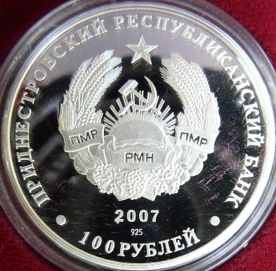 32 mm diametru, 14.14 g, argint 92.5%, margine netedă Avers: valoarea nominală 100 RUBLEI, stema autoproclamatei republici transnistrene (cu secera și ciocanul), inscripția · PRIDNESTROVSKII RESPUBLIKANSKII BANK · (cu litere chirilice) însemnînd BANCA REPUBLICANĂ [TRANS] NISTREANĂ, anul 2007, dedesubt 925 reprezentînd titlul argintului | Revers: stema orașului Rîbnița, cu anul primei menționări documentare - 1628, inscripția RÎBNIȚA (în rusă, cu litere chirilice), ornamente Tiraj: 500 exemplare |