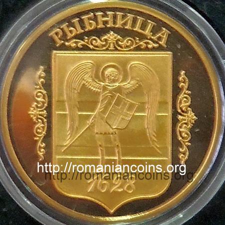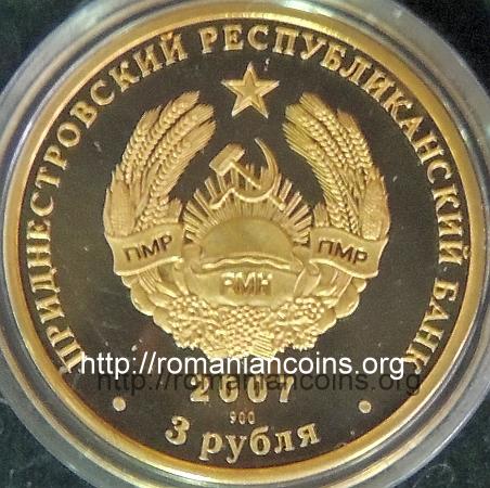21 mm diametru, 8 g, aur 90%, margine netedă Avers: valoarea nominală 3 RUBLIA, stema autoproclamatei republici transnistrene (cu secera și ciocanul), inscripția · PRIDNESTROVSKII RESPUBLIKANSKII BANK · (cu litere chirilice) însemnînd BANCA REPUBLICANĂ [TRANS] NISTREANĂ, anul 2007, dedesubt 900 reprezentînd titlul aurului | Revers: stema orașului Rîbnița, cu anul primei menționări documentare - 1628, inscripția RÎBNIȚA (în rusă, cu litere chirilice), ornamente Tiraj: 100 exemplare |