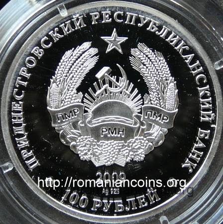 margine netedă valoarea nominală 100 RUBLEI, stema autoproclamatei republici transnistrene (cu secera și ciocanul), inscripția · PRIDNESTROVSKII RESPUBLIKANSKII BANK · (cu litere chirilice) însemnînd BANCA REPUBLICANĂ [TRANS] NISTREANĂ, anul 2009, sub an Ag 925 reprezentînd titlul argintului | Revers: un bou desenat în stil chinezesc, inscripția GOD ZEMLEANOVO BÎKA (în rusă, cu litere chirilice) însemnînd ANUL BOULUI DE PĂMÎNT, anul 2009 și o hieroglifă chinezească reprezentînd anul boului