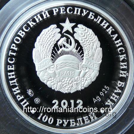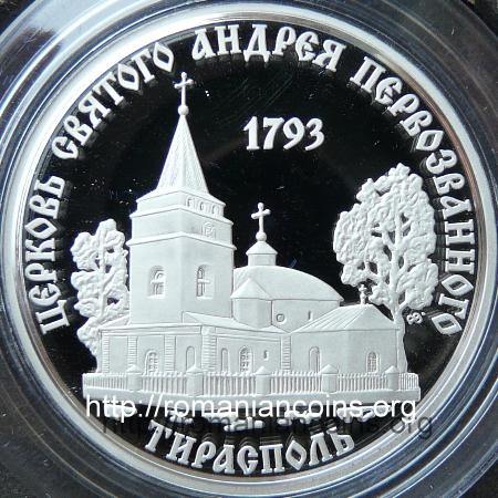 32 mm diametru, 14.14 g, argint 92.5%, margine netedă Avers: valoarea nominală 100 RUBLEI, stema autoproclamatei republici transnistrene (cu secera și ciocanul), inscripția · PRIDNESTROVSKII RESPUBLIKANSKII BANK · (cu litere chirilice) însemnînd BANCA REPUBLICANĂ [TRANS] NISTREANĂ, anul 2012, la stînga semne de monetărie (MMD și cap de rusoaică - posibil marcajul rusesc pentru bijuterii de argint), la dreapta Ag925 reprezentînd titlul argintului | Revers: reprezentarea bisericii Sfîntul Andrei, în cîmp anul construcției, 1793, inscripția circulară ȚERCOVÎ SVIATOGO ANDREIA PERVOZVANNOGO însemnînd BISERICA SFÎNTULUI ANDREI CEL DINTÎI CHEMAT, în exergă TIRASPOL Tiraj: 250 exemplare |