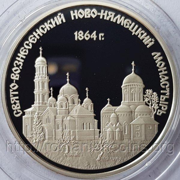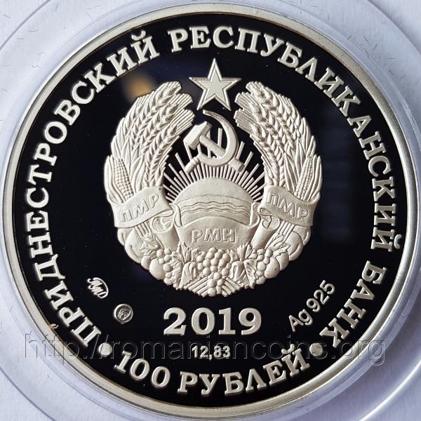 32 mm diametru, 12.83 g, argint 92.5%, margine netedă Avers: valoarea nominală 100 RUBLEI, stema autoproclamatei republici transnistrene (cu secera și ciocanul), inscripția · PRIDNESTROVSKII RESPUBLIKANSKII BANK · (cu litere chirilice) însemnînd BANCA REPUBLICANĂ [TRANS] NISTREANĂ, anul 2019, la stînga semne de monetărie (MMD și cap de rusoaică - posibil marcajul rusesc pentru bijuterii de argint), la dreapta Ag925 reprezentînd titlul argintului, dedesubt 12,83, reprezentînd masa monedei în grame | Revers: o imagine de la Mănăstirea Noul Neamț, cu turnul clopotniță și cu două din biserici, în cîmp inscripția 1864 G. însemnînd (anul) 1864 (anul înființării mănăstirii), inscripția SVEATO-VOZNESENSKII NOVO-NEAMEȚKII MONASTÎR (cu litere chirilice) însemnînd MĂNĂSTIREA ÎNĂLȚAREA DOMNULUI NOUL NEAMȚ Tiraj: 250 de exemplare |