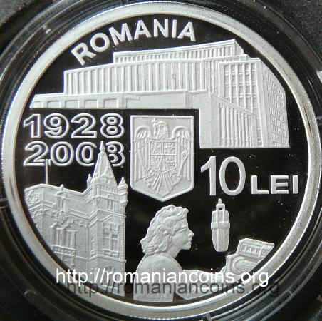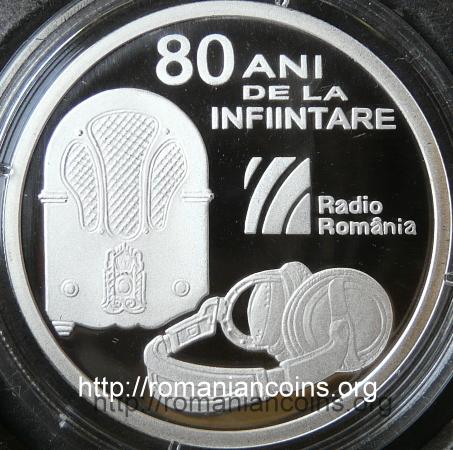 37 mm diametru, 31.103 g, argint 99.9%, margine cu zimți Avers: ROMANIA, sediul actual al Radio România, anii 1928 și 2008, stema României, valoarea nominală 10 LEI, sediul inițial al Societății de difuziune radiotelefonică, o crainică din perioada interbelică vorbind la microfon | Revers: inscripția "80 ANI DE LA INFIINTARE", un aparat de radio din anii '30, sigla actuală a Radio România (inscripția Radio România face parte din siglă), o pereche de căști