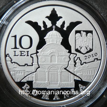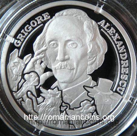 37 mm diametru, 31.103 g, 99.9% argint, margine cu zimți Avers: valoarea nominală 10 LEI, stema României, anul 2010, ROMANIA, o imagine a mănăstirii Cozia cu biserica în prim-plan, deasupra conturul lui Mircea cel Bătrîn din fresca de la biserica episcopală din Curtea de Argeș (datînd din 1526), cele două reprezentări împreună trimițînd la poezia Umbra lui Mircea. La Cozia”, scrisă de Grigore Alexandrescu în anul 1842 | Revers: portretul poetului și cîteva din personajele fabulelor acestuia Cîinele și cățelul”, Vulpoiul predicător” și Boul și vițelul” (dulăul de curte Samson și cățelul Samurache, un vulpoi, un vițel și un bou cu joben), inscripția GRIGORE ALEXANDRESCU