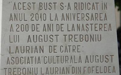 ![]() Inscripþia votivã de pe soclu: Acest bust s-a ridicat în anul 2010 la aniversarea a 200 de ani de la naºterea lui August Treboniu Laurian de cãtre Asociaþia culturalã August Treboniu Laurian din Fofeldea |