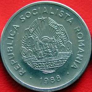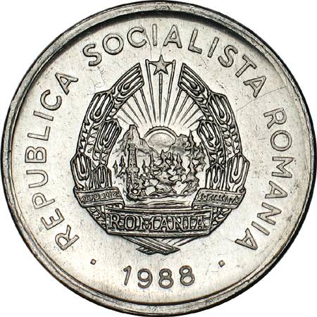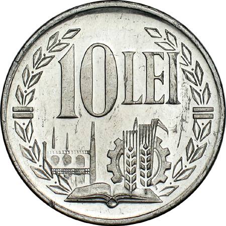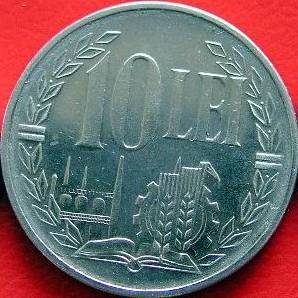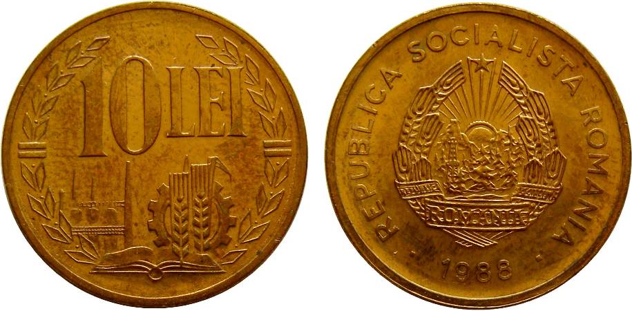 ? mm diametru, ? g, aluminiu valoarea nominală 10 LEI, cunună de lauri, o carte deschisă, o roată dințată, două spice de grîu, un coș de fum și niște forme amintind de un peisaj industrial | ROMANIA SOCIALISTA ROMANIA, 1988 între două pătrate și stema țării |