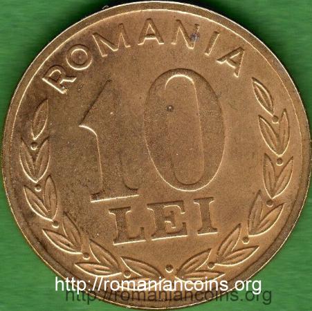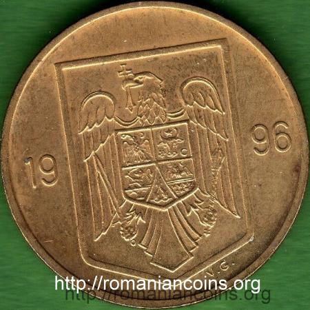 23 mm diametru, 4.58 g, oțel placat cu alamă, muchie netedă ROMANIA, valoarea nominală 10 LEI în interiorul unei cununi din ramuri de laur | anul 1996 și stema României; lîngă margine (în dreapta) sînt inițialele gravorului, Vasile Gabor |