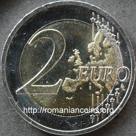 Imaginea de pe revers a fost aleasă în urma unei competiții organizate de Directoratul General pentru Afaceri Economice și Financiare (DG ECFIN) al Comisiei Europene. La finala concursului, desfășurată pe Internet, au participat 5 modele, selectate de un juriu din cele peste 800 de proiecte înscrise inițial. Aproape 35000 de oameni au fost interesați de acest concurs și au votat pentru unul din cele 5 modele. Au votat numai locuitori din țările membre ale zonei euro. Desenul cîștigător, operă a designerului Helmut Andexlinger de la Monetăria Austriei, a întrunit 34% din voturi - cu 1% mai mult decît următorul clasat. Inițialele cîștigătorului au fost trecute pe monede (pe moneda românească de argint acestea nu au fost trecute). Toate cele 17 țări din zona euro au emis în 2012 monede omagiale de circulație de 2 euro cu acest desen - în total, cam 90 de milioane de piese. O astfel de monedă, emisă de Germania, este prezentată în imaginile de mai jos.