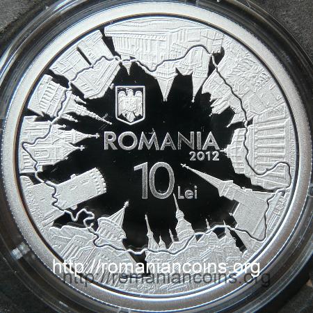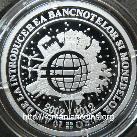 37 mm diametru, 31.103 g, 99.9% argint, margine cu zimți Avers: stema României, ROMANIA, anul 2012, valoarea nominală 10 LEI, monumente reprezentative pentru România, plasate circular, cu baza de circumferință, deasupra marcat conturul hărții României | Revers: în interiorul unui cerc liniar un desen ce simbolizează modurile în care moneda euro a devenit, în numai 10 ani, o monedă de importanță mondială, anii 2002 și 2012 și, în afara cercului liniar interior, inscripția circulară 10 ANI DE LA INTRODUCEREA BANCNOTELOR SI MONEDELOR EURO