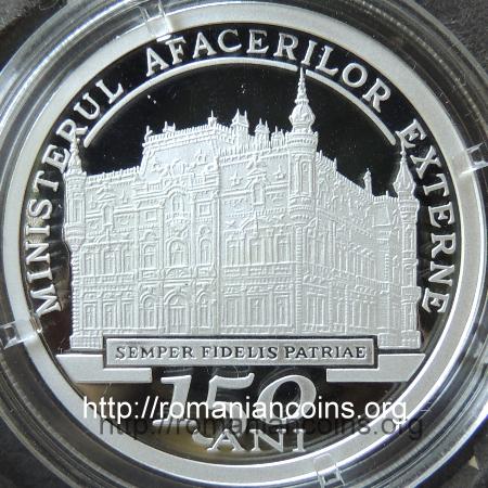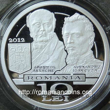 37 mm diametru, 31.103 g, 99.9% argint, margine cu zimți Avers: anul 2012, stema României, ROMANIA, valoarea nominală 10 LEI, în stînga bustul lui Apostol Arsache, în dreapta bustul lui Alexandru Ioan Cuza, purtînd inscripțiile APOSTOL ARSACHE și ALEXANDRU IOAN CUZA | Revers: imaginea Palatului Sturdza, în care a funcționat o perioadă Ministerul Afacerilor Externe, deviza latină folosită de minister - SEMPER FIDELIS PATRIAE (însemnînd ÎNTOTDEAUNA CREDINCIOS PATRIEI; adoptată în anul 2010, cînd ministru era domnul Teodor Baconschi) și inscripția MINISTERUL AFACERILOR EXTERNE 150 ANI