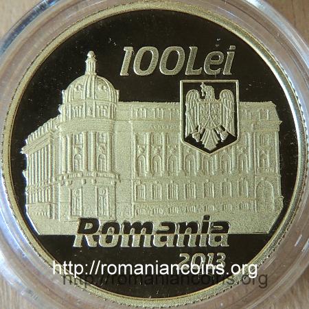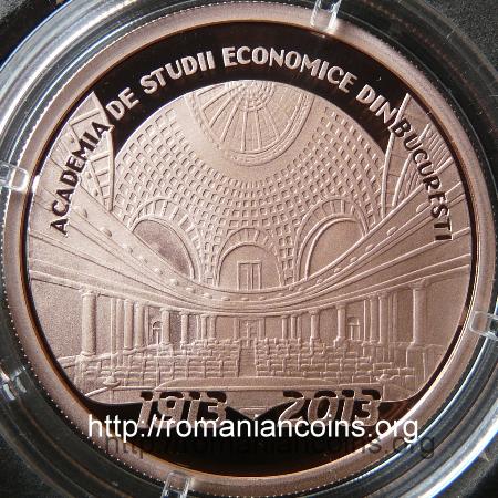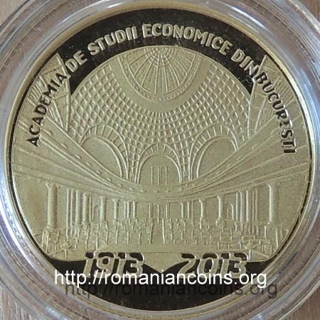 21 mm diametru, 6.452 g, 90% aur, margine cu zimți Avers: valoarea nominală 100 LEI, stema României, ROMANIA, anul 2013, palatul Academiei de Științe Economice din București | Revers: aula din palatul ASE, inscripția ACADEMIA DE STUDII ECONOMICE DIN BUCURESTI, anii 1913 și 2013